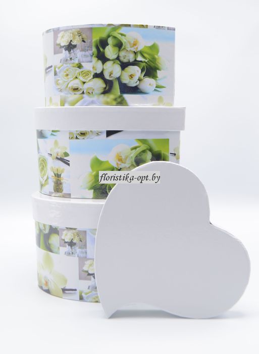 Коробки картонные набор из 3 сердец с фотопечатью белые тюльпаны для цветов и подарков оптом и в розницу Минск. Прекрасно подходят для цветочных композиций, а так же для упаковки подарков. Опт 8 044 7785028, розница 8029 1753333 или e-mail: merab@tut.by