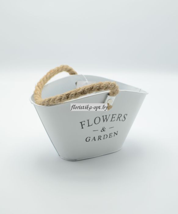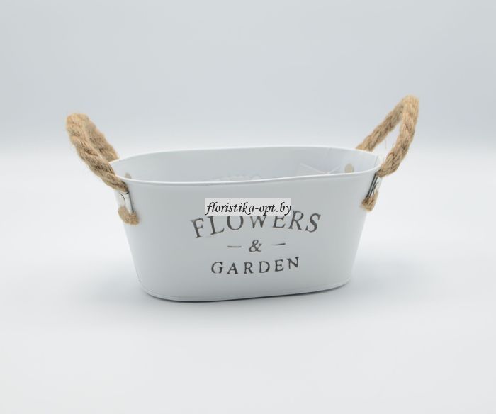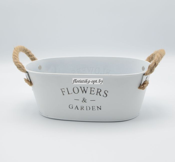 Плошка металлическая овальная белая с джутовыми ручками купить оптом и в розницу для комнатных растений, цветов и букетов. Приглашаем за покупками оптом на наш склад г. Минск, 2 пер. Крыловича, 21 и в розницу в цветочный магазин "ЦВЕТЫ ФЛОРИСТИКА ДЕКОР", г. Минск, пр-т Дзержинского, 20. Телефон за связи: опт: 8 029 778 50 28, розница: 8 029 175 33 33